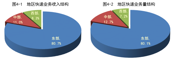 1月,東、中、西部地區(qū)快遞業(yè)務收入的比重分別為80.7%、11%和8.3%,業(yè)務量比重分別為80.1%、12.7%和7.2%。與去年同期相比,東部地區(qū)快遞業(yè)務收入比重下降了1.1個百分點,快遞業(yè)務量比重下降了1.6個百分點;中部地區(qū)快遞業(yè)務收入比重上升了0.9個百分點,快遞業(yè)務量比重上升了1.4個百分點;西部地區(qū)快遞業(yè)務收入比重上升了0.2個百分點,快遞業(yè)務量比重上升了0.2個百分點。