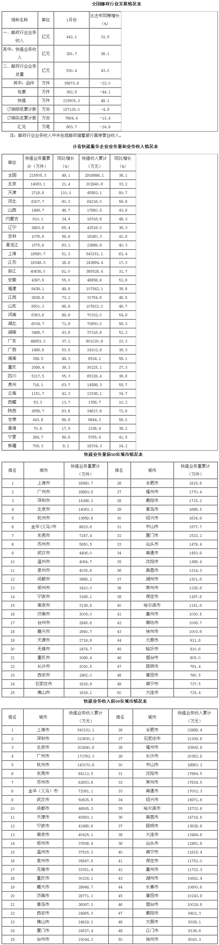 1月,郵政企業(yè)和全國快遞服務企業(yè)業(yè)務收入(不包括郵政儲蓄銀行直接營業(yè)收入)完成442.1億元,同比增長32.5%;業(yè)務總量完成530.4億元,同比增長43%。